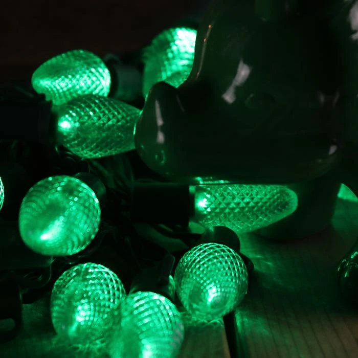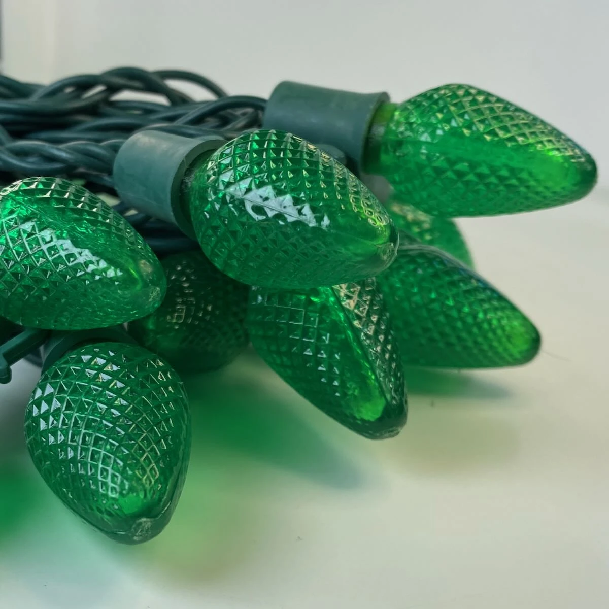 These plug-and-play LED light strings are constructed with a 3-wire 22-AWG low-current wiring harness. The C7 lenses are sealed into their bases making them moisture resistant. (These are not separate bulbs and cords but strings. See