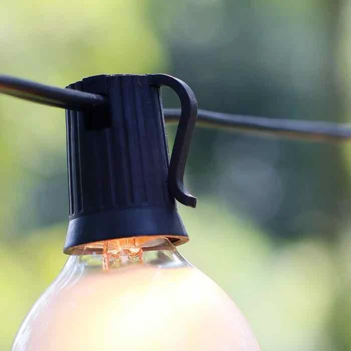 This C7 100 foot Commercial Grade Cord comes with 100 sockets spaced 12 inches apart. This black cord is designed to blend in nicely with rooflines, doorways, porches, and metal trim work. This makes it perfect for residential and commercial properties. Note this cord is shipped with a single male 5-amp rated plug tailored for use with LED or 5-watt bulbs. There is no female plug at the end of the cord.