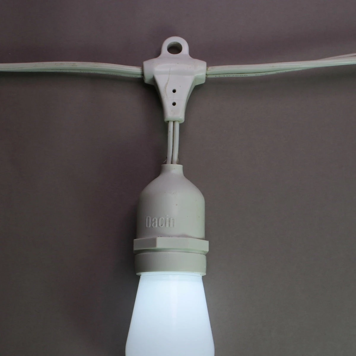 Heavy-duty SPT-2 commercial grade cords are weather resistant and manufactured to be used outdoors but work great for indoor spaces as well. With white wiring and sockets, these cords are ideal for spanning wide spaces across porches, amusement park walkways, and restaurant patios. Keep in mind that this cord will require 165 incandescent or LED bulbs with E26 (medium) bases to fill each of the sockets spaced 24 inches apart.